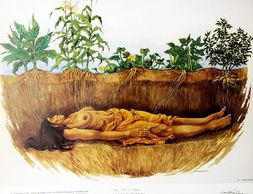 This is about the birth of two twins, Flint the daughter and Taharonhiaw-:kon the son. Their mother died at their birth and Flint accused her brother Taharonhiaw-:kon of this act. When the twins buried their mother, she became “mother earth.” The heavens declared that the sustenance of her body will allow things to grow every year. “So, when the twins and their grandmother buried their mother’s body, she became “mother earth” and from her head grew the native tobacco, from her breast grew the corn, from her stomach grew the squash, from her fingers grew the beans, and from her feet grew potatoes.” https://jakethomaslearningcentre.ca/creation-prints.